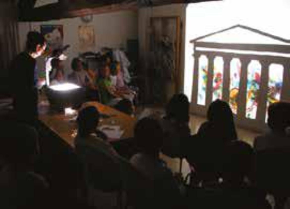Letture animate dove le parole e le immagini si vestono di un linguaggio narrativo che fa uso di strumenti quali la lavagna luminosa, le sagome di cartone e materiali di scarto come sacchetti di nylon, fili, tappi, bottiglie di plastica, etc.