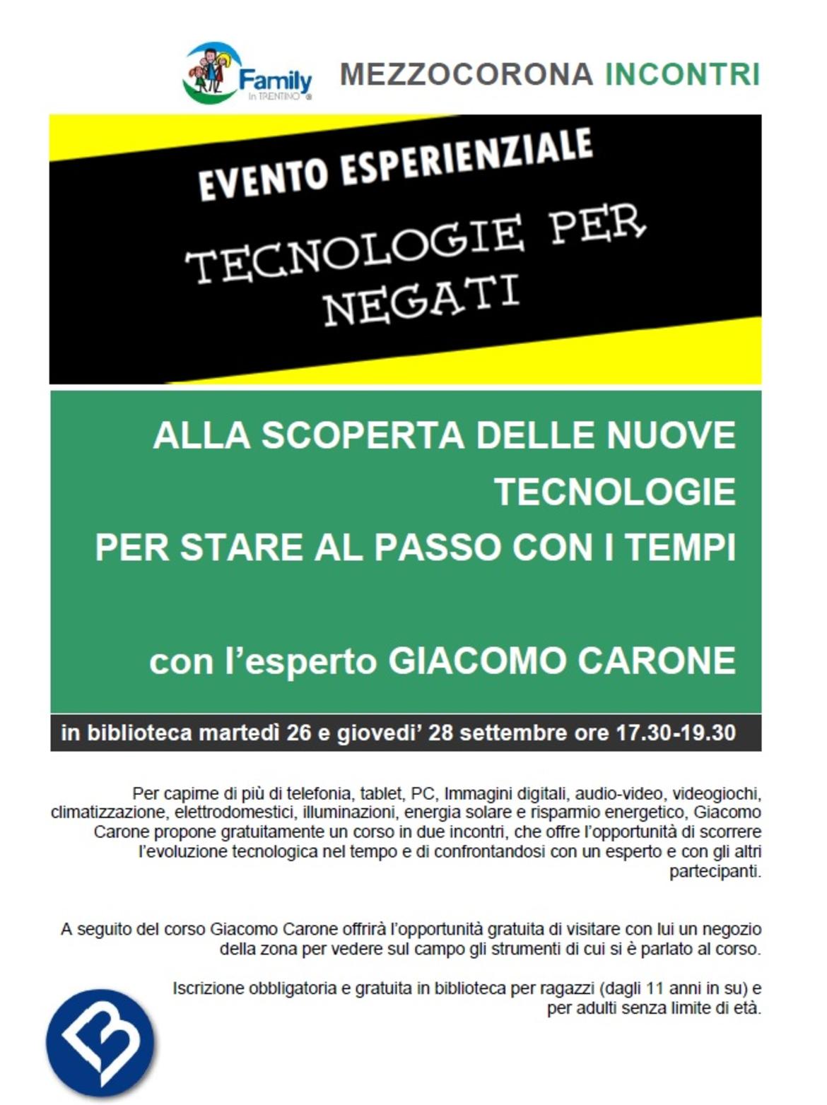 Per capirne di più di telefonia, tablet, pc, immagini digitali, audio-video, videogiochi, climatizzazione, elettrodomestici, illuminazioni, energia solare e risparmio energetico, Giacomo Carone propone gratuitamente un corso in due incontri, che offre l’opportunità di scorrere l’evoluzione tecnologica nel tempo e di confrontandosi con un esperto e con gli altri partecipanti.
