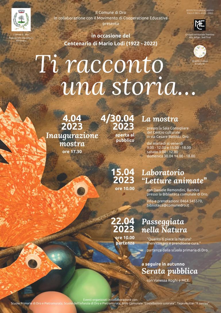 Il Comune di Dro in collaborazione con il Movimento di Cooperazione educativa MCE sez. Trentino Alto Adige, e le realtà educative presenti sul territorio comunale, quali il nido "Costellazioni colorate", il servizio Tagesmutter "il Sorriso", le scuole dell'infanzia e le scuole primarie, hanno dato vita ad un progetto dal titolo "Un anno speciale per un maestro speciale, iniziato a settembre 2022, in cui hanno riprodotto le storie del maestro con laboratori, storie animate, murales, pannelli, riproduzioni con I-Theatre, video e tanto altro. Attraverso importanti momenti di scambio ed interazioni tra i bambini e le bambine delle realtà educative, si è voluto concretizzare il metodo pedagogico ed educativo di Mario Lodi, sempre attuale e contemporaneo, stimolare la lettura sin dalla più tenera età, rendere i bambini protagonisti dell'intero progetto, che è culminato nella mostra in esposizione da aprile a maggio 2023.