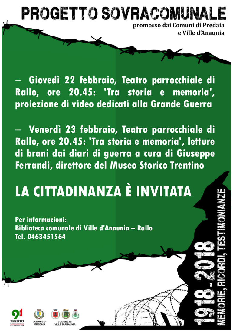 Nell'ambito delle iniziative rientranti nella manifestazione sovracomunale 1918-2018, memorie, ricordi, testimonianze, organizzata per la commemorazione del centenario dalla fine della Grande Guerra, i diari di tre soldati conservati da altrettanti cittadini di Ville d'Anaunia loro discendenti verranno presentati con la lettura di brani sotto il coordinamento del direttore del Museo storico trentino Giuseppe Ferrandi.