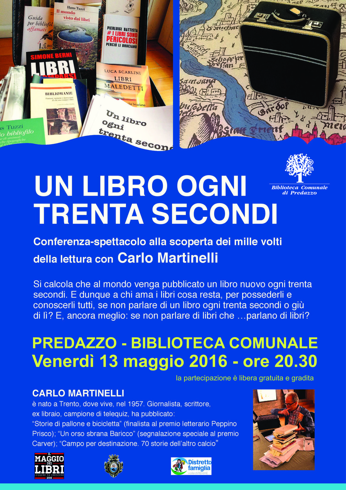 PREDAZZO. Continua il viaggio di “Un libro ogni trenta secondi”, la conferenza - spettacolo di Carlo Martinelli alla scoperta dei mille volti della lettura. Un viaggio divertito e scanzonato, rigoroso nella documentazione e nella narrazione di fatti, autori, episodi, titoli.