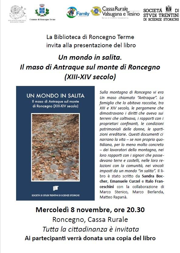 Una famiglia che abitava sulla montagna di Roncegno, in un maso chiamato “Antraque”, raccolse fra XIII e XIV secolo diverse pergamene: oggi questi documenti ci parlano della vita quotidiana, del lavoro, della vita di famiglie vissute nel Medioevo nel nostro territorio. Un frammento di storia locale che sarà ricostruito dagli autori nel corso della presentazione.