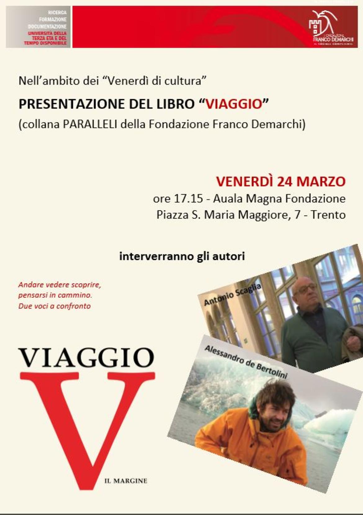 Nell'ambito dei "Venerdì di cultura" la Fondazione Franco Demarchi propone la presentazione del libro "Viaggio" degli autori Antonio Scaglia ed Alessandro de Bertolini che saranno presenti all'evento e si confronteranno sul tema del viaggio, introducendo il lettore alle molteplici dimensioni del viaggiare umano: si, viaggiare, ma "come" viaggiare? e perché? per sperimentare luoghi diversi, luoghi che non ci appartengono ma magari ci "aspettano". Il viaggio, quello con la V maiuscola, quello sottratto alle urgenze compulsive del lavoro e del turismo, è comunque un'esperienza esistenziale straordinaria e necessaria perché viene pensato, immaginato, vissuto prima di essere compiuto. E poi viene metabolizzato, trasfigurato. "Viaggio quindi sono" si potrebbe dire all'uomo in generale, e dell'uomo contemporaneo nello specifico, Viaggi drammatici per sopravvivere, per milioni di persone. Viaggi per vivere, comunque e in ogni caso. Per sentirsi vivi.