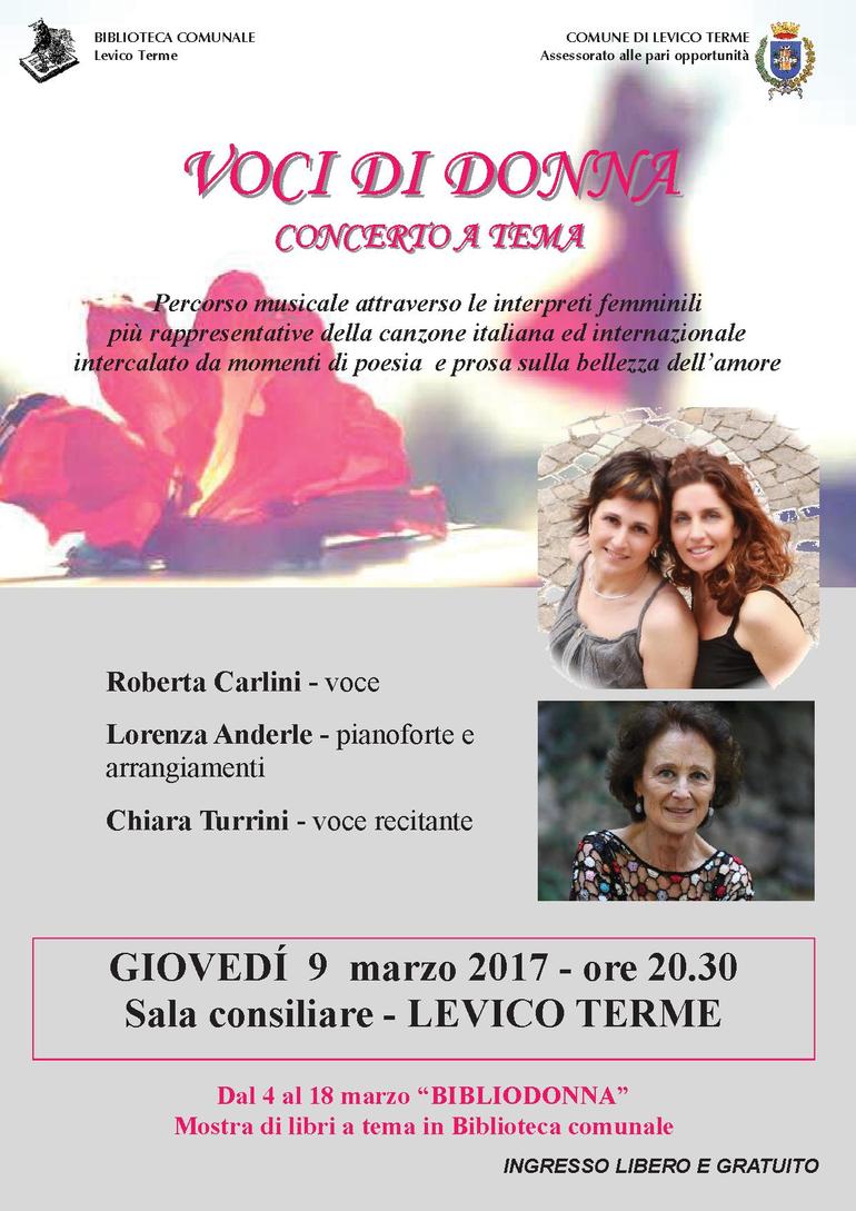 Percorso musicale attraverso le interpreti femminili più rappresentative della canzone italiana ed internazionale intercalato da momenti di poesia e prosa sulla bellezza dell’amore con Roberta Carlini - voce, Lorenza Anderle - pianoforte e arrangiamenti, Chiara Turrini - voce recitante.