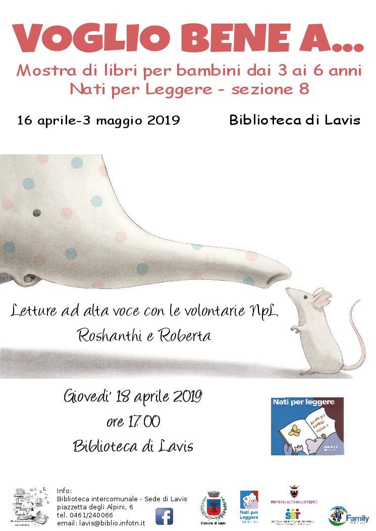 La Biblioteca di Lavis ospita dal 16 aprile al 3 maggio 2019 l'ottava sezione della mostra Nati per Leggere dal titolo Voglio bene a..., visitabile in orario di apertura della Biblioteca.