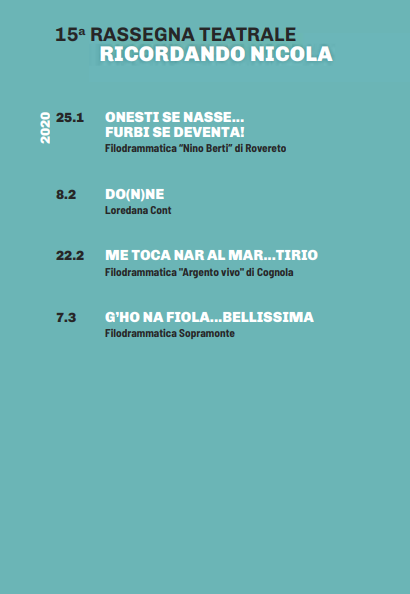 Filodrammatiche da tutto il Trentino vengono invitate a recitare facendo trascorrere momenti di ilarità alle persone che desiderano vederle.Quest'anno a rallegrare l'affezionatissimo pubblico ci saranno la filodrammatica di Rovereto, Cognola, Sopramonte e Loredana Cont.