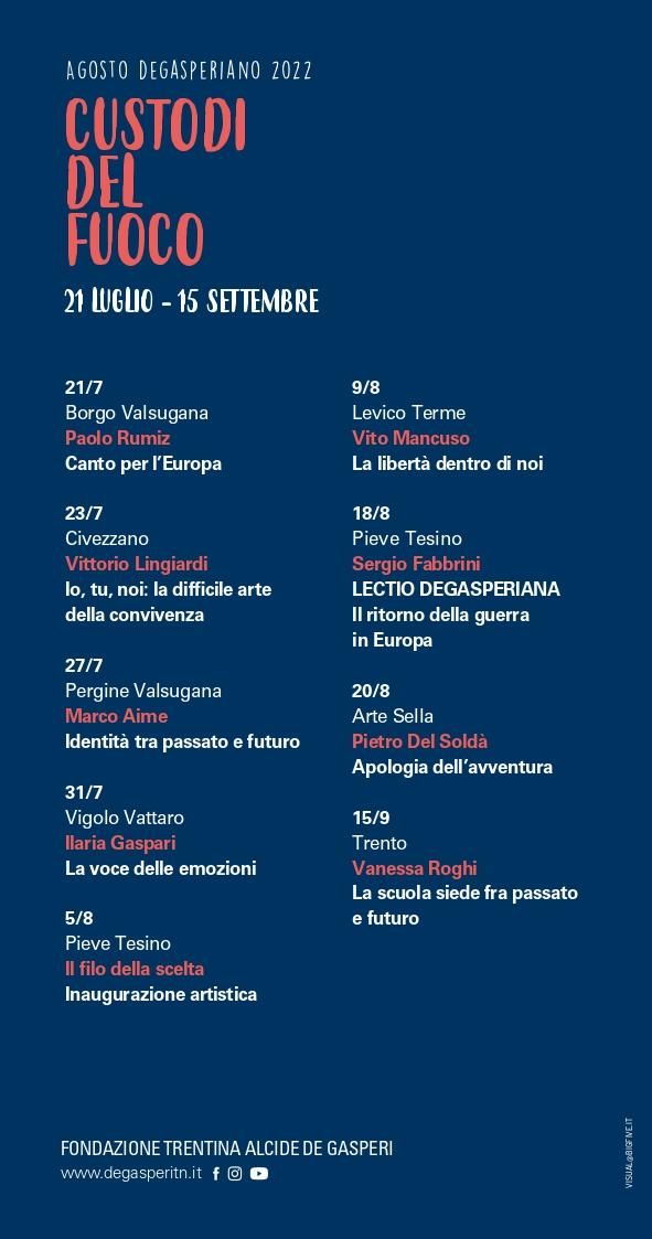Dal 21 luglio al 15 settembre 2022 torna l’appuntamento con l’Agosto degasperiano, la rassegna di eventi organizzata ogni estate dalla Fondazione Trentina Alcide De Gasperi che attraversa i luoghi cari allo statista trentino facendone teatro di una riflessione di ampio respiro sulle sfide del vivere civile.
