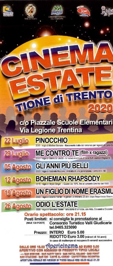 Si tratta di “Cinema Estate 2020”: una rassegna cinematografica all’aperto che si terrà tutti i mercoledì, dalle 21:15, presso il piazzale delle scuole elementari di Tione di Trento.