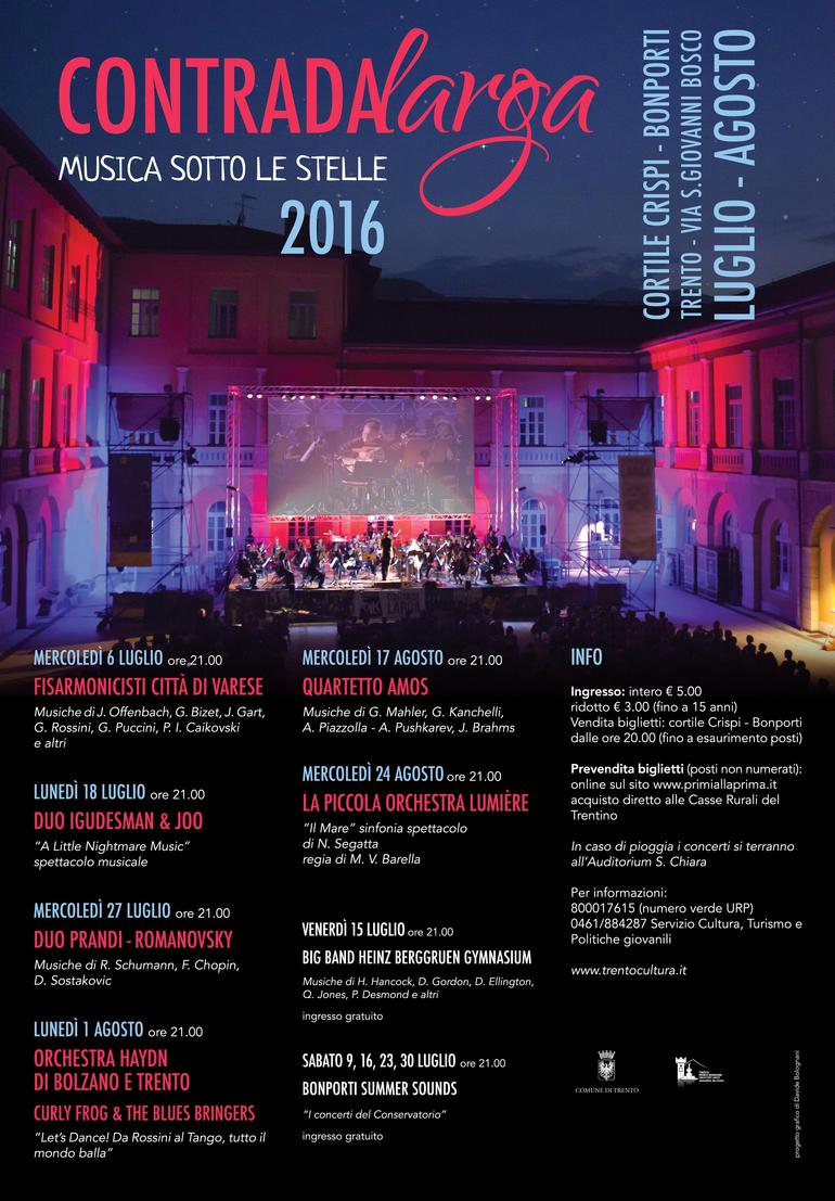 Le tradizionali manifestazioni estive di musica e cinema all'aperto anche quest'anno saranno ospitate nel cortile interno del neorestaurato edificio di via San Giovanni Bosco, sede delle scuole Crispi e del Conservatorio Bonporti di Trento.