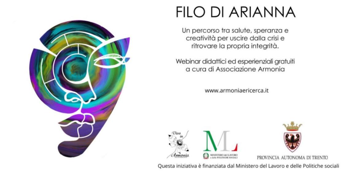 Nasce in risposta a tempi così incerti e confusi come quelli odierni, in cui il sentore che sale è quello di smarrimento, il calendario di eventi “Filo di Arianna: un percorso tra salute, speranza e creatività per uscire dalla crisi e ritrovare la propria integrità”. L’iniziativa è ideata, proposta e realizzata da Associazione di promozione sociale Armonia, per lo studio e lo sviluppo della persona di Rovereto, grazie al sostegno di Ministero del Lavoro e delle Politiche Sociali e quello della Provincia Autonoma di Trento.