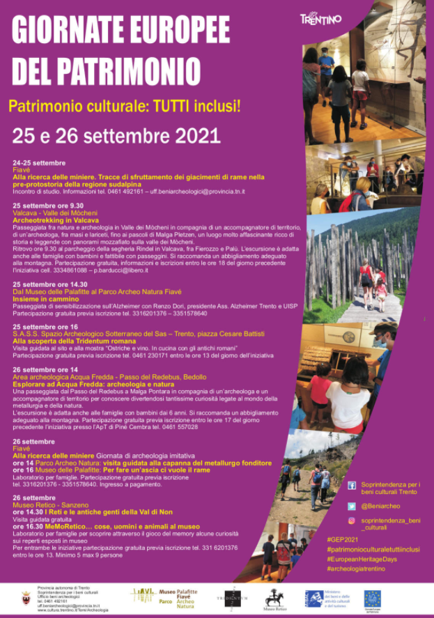 Per entrambe le iniziative la partecipazione è gratuita previa iscrizione tel. 331 6201376 entro le ore 13 del giorno dell’iniziativa. Per condividere, partecipare e taggare sui social: #GEP2021 #patrimonioculturaletuttiinclusi #EuropeanHeritageDays #EHDs #archeologiatrentino