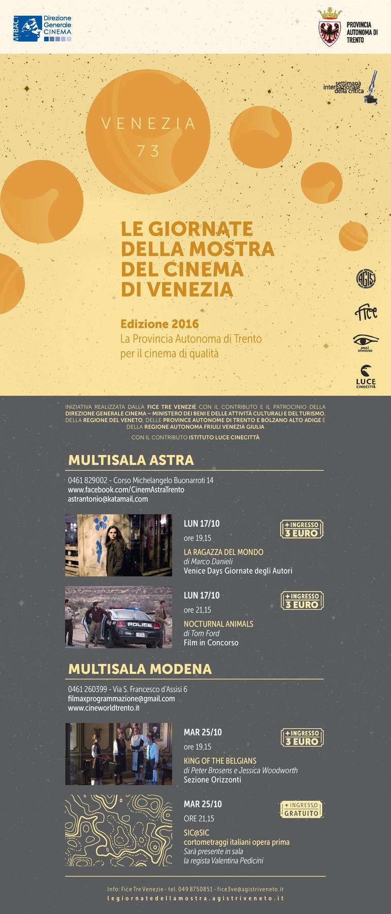 Prosegue anche quest’anno la presentazione in anteprima di una selezione di film proiettati nelle Sezioni ufficiali della 73^ Mostra Internazionale d’Arte Cinematografica di Venezia. Si completa, in tal modo, l’offerta di cinema che ha visto la circuitazione dei film della Settimana Internazionale della Critica, con un prodotto sempre d’autore ma proveniente da esperienze più mature e consolidate nel panorama internazionale. Si tratta di un’offerta di altissimo livello che colloca la città di Trento all’interno di un Circuito Triveneto che ha saputo valorizzare le iniziative del territorio ed estenderle progressivamente a tutto il Nord Est. Orgogliosi di tutto ciò, siamo certi che il pubblico saprà apprezzare un’opportunità unica che colloca Trento alla pari delle maggiori città italiane quanto ad offerta cinematografica di qualità.