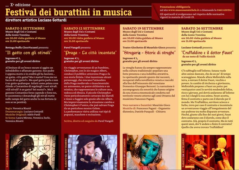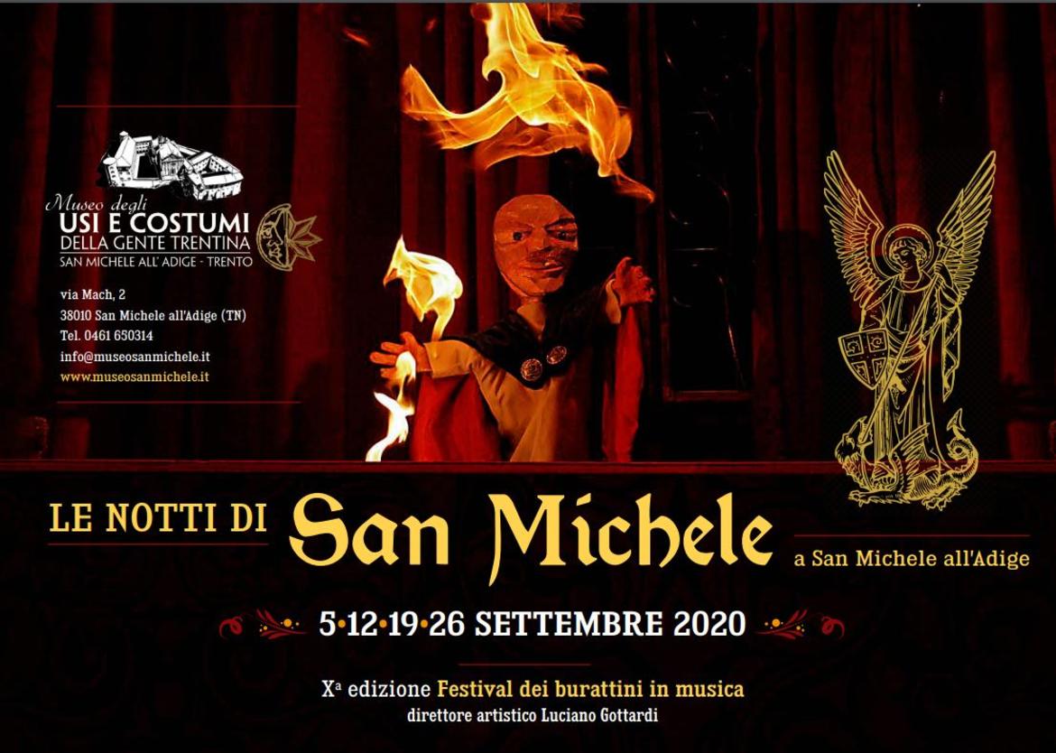 Anche quest’anno il Museo degli Usi e Costumi della Gente Trentina propone quattro spettacoli altamente qualificati per “Le notti di San Michele” durante il mese di settembre. A partire da sabato 5 è in programma il “Festival dei burattini in musica”: appuntamenti di teatro di figura da non perdere con accompagnamento musicale dal vivo che si rivolgono a un pubblico di tutte le età. La direzione artistica del Festival è curata ormai da dieci edizioni, da Luciano Gottardi, burattinaio trentino che da anni collabora con il Museo