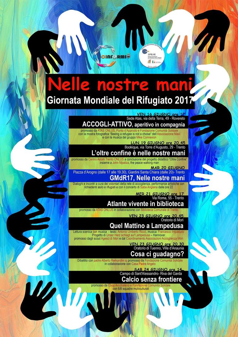 Si rinnova quindi quest'anno la sinergia fra diverse realtà attive nel rispondere concretamente al fenomeno dei migranti forzati. Una sinergia che accanto alla quotidiana collaborazione nell'ambito del progetto di accoglienza dei richiedenti protezione internazionale si concretizza anche in un ampio programma di variegate proposte ma con un unico messaggio: il futuro delle persone in fuga che chiedono aiuto e la risposta di ognuno di noi, e quindi della nostra comunità è, appunto, #nellenostremani.
