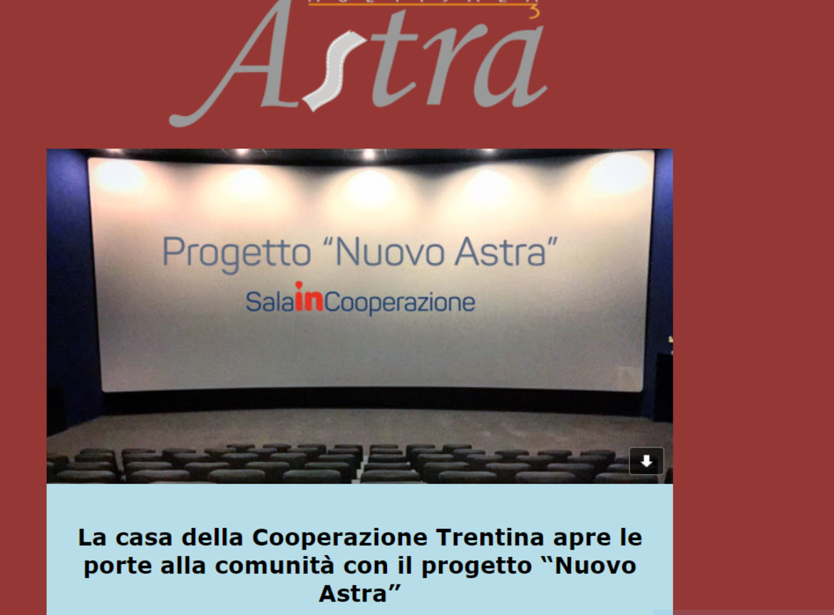 “Nuovo Astra” è il nome scelto per il progetto come segno di continuità, all’interno di una nuova società che nascerà nei prossimi giorni con la veste di impresa sociale. La nuova società intende cercare di portare avanti il lavoro sviluppato in questi anni dal Cinema Astra e possibilmente di potenziarlo, sia nei contenuti – non solo cinema – che nella presenza al di fuori della città di Trento. “L’idea è quella di costituire un soggetto capace di lavorare e di far lavorare insieme tutta una serie di realtà - spiega Paolo Fellin, presidente della società cooperativa Vales e promotore dell’iniziativa – che, a vario titolo, si occupano di promozione culturale e di formazione, al fine di riuscire a coordinare al meglio le diverse attività e realizzare una proposta diffusa sul territorio. L’idea è quella di mantenere un centro fisso nella Sala inCooperazione, unitamente ad almeno un altro punto, ancora da definire”.
