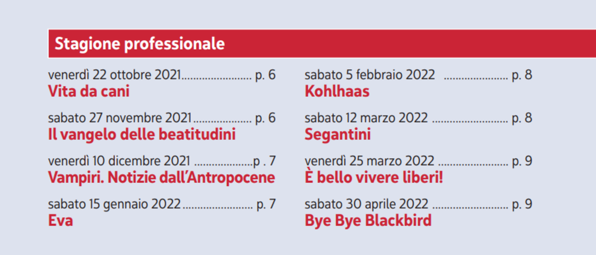 AbbonamentiGrande abbonamento (8 spettacoli professionali + 6 amatoriali) 80 € intero / 70 € ridotto / 60 € speciale associazioni