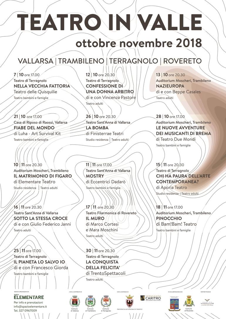 Il 10 novembre all’auditorium di Moscheri di Trambileno andrà in scena il primo studio frutto dell’Instant Residence condotta da Elementare Teatro, che porterà sul palco Il matrimonio di Figaro mentre l'11 novembre al Sant’Anna di Vallarsa la compagnia Eccentrici Dadarò presenta Mostry, dedicato bambini e famiglie. Seguirà il 15 novembre al teatro parrocchiale di Piazza di Terragnolo la compagnia Aporia Teatro presenta il primo studio dello spettacolo Chi ha paura dell’arte contemporanea? e il 16 novembre Giulio Federico Janni sarà sul palco del Sant’Anna di Vallarsa con Sotto la stessa croce.