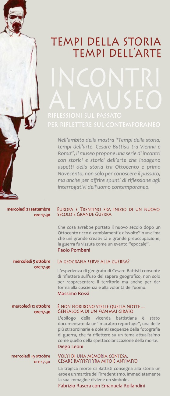 Nell’ambito della mostra “Tempi della storia, tempi dell’arte. Cesare Battisti tra Vienna e Roma”, il museo propone una serie di incontri con storici e storici dell’arte che indagano aspetti della storia tra Ottocento e primo Novecento, non solo per conoscere il passato, ma anche per offrire spunti di riflessione agli interrogativi dell’uomo contemporaneo.
