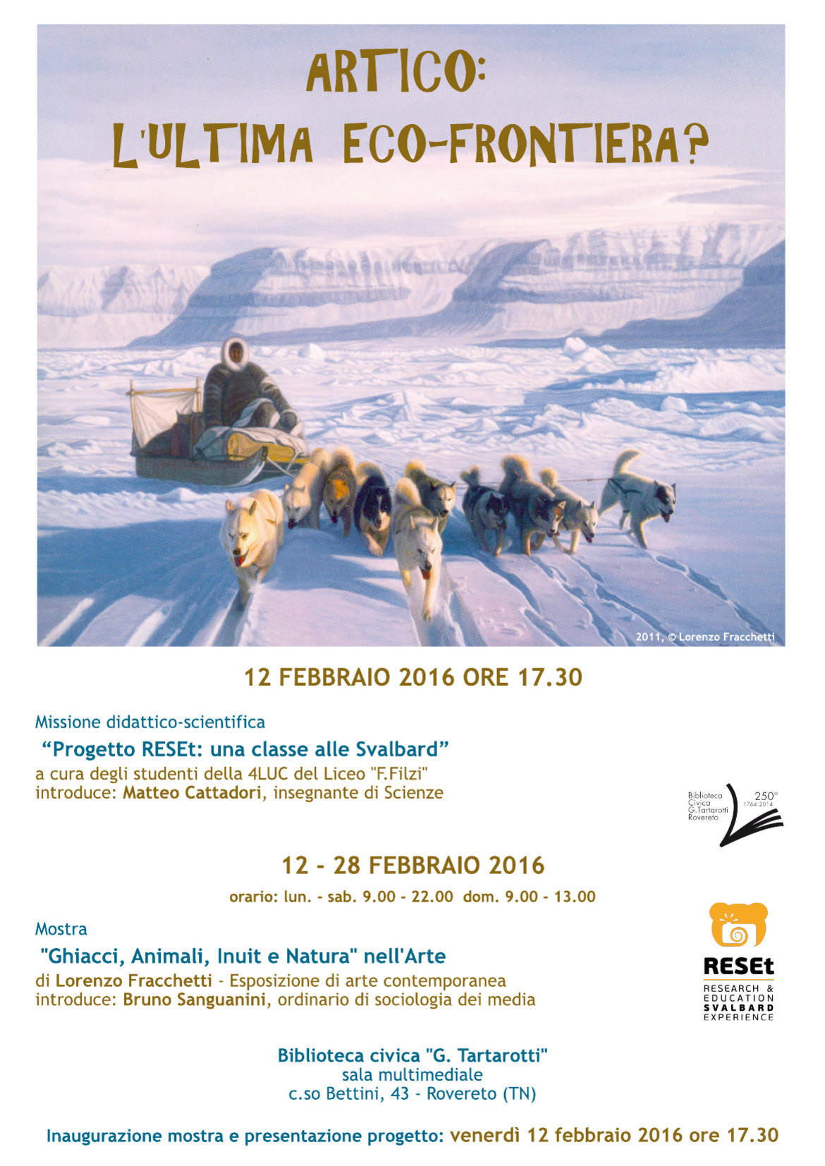 Inaugurazione venerdì 12 febbraio alle ore 17.30 nella sala multimediale della Biblioteca civica "G. Tartarotti" di Rovereto, nell'occasione sarà presentato il progetto RESET di una classe Liceo “F. Filzi” di Rovereto, che, con il proprio prof. di scienze Matteo Cattadori, sta raccogliendo fondi per organizzare un viaggio-studio alle isole Svalbard.