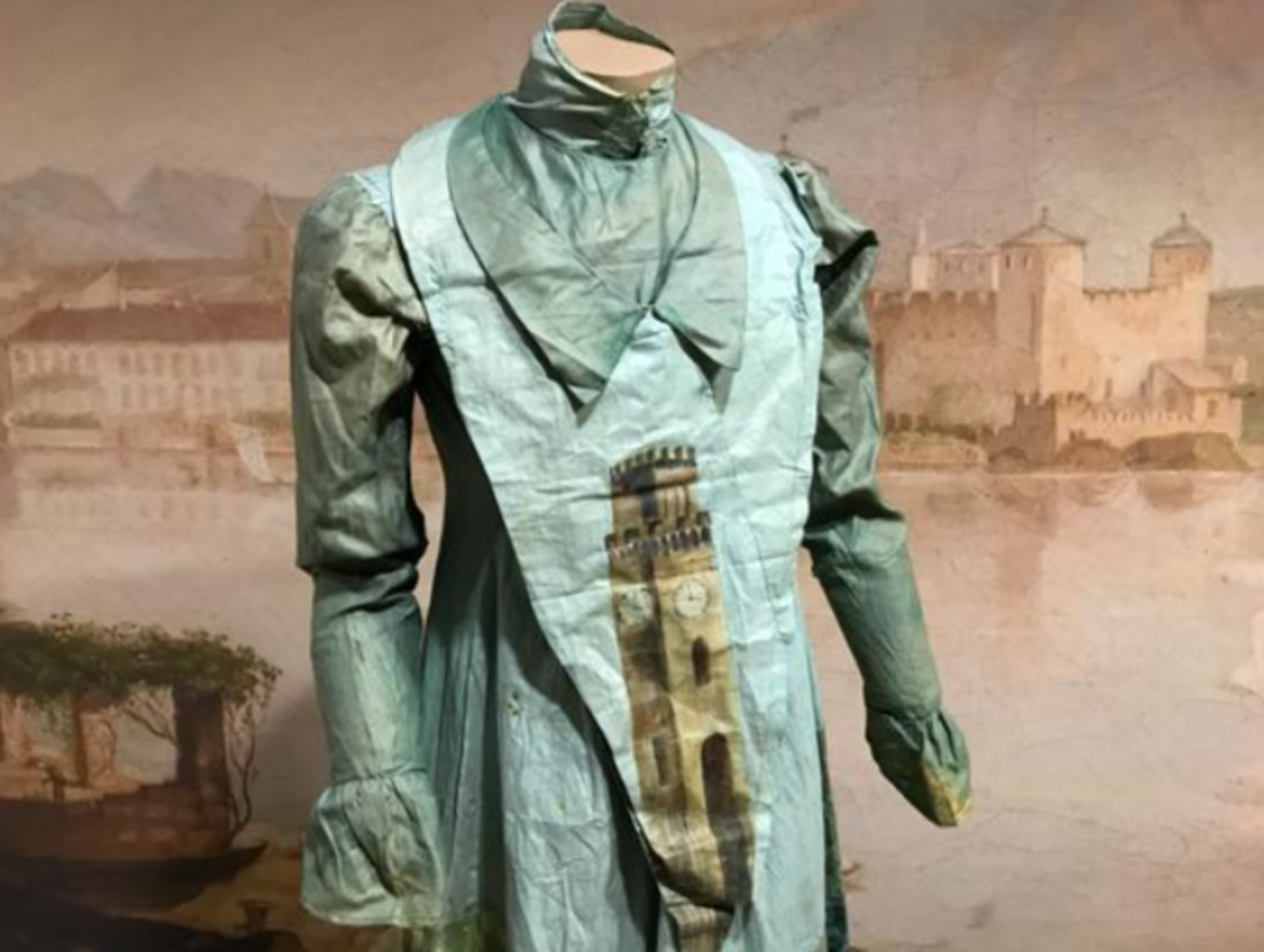 Si tratta di un vestito femminile ricco di dettagli e decorato a mano con vedute di Riva del Garda, probabilmente appartenuto a una donna rivana e indossato in occasioni mondane.
