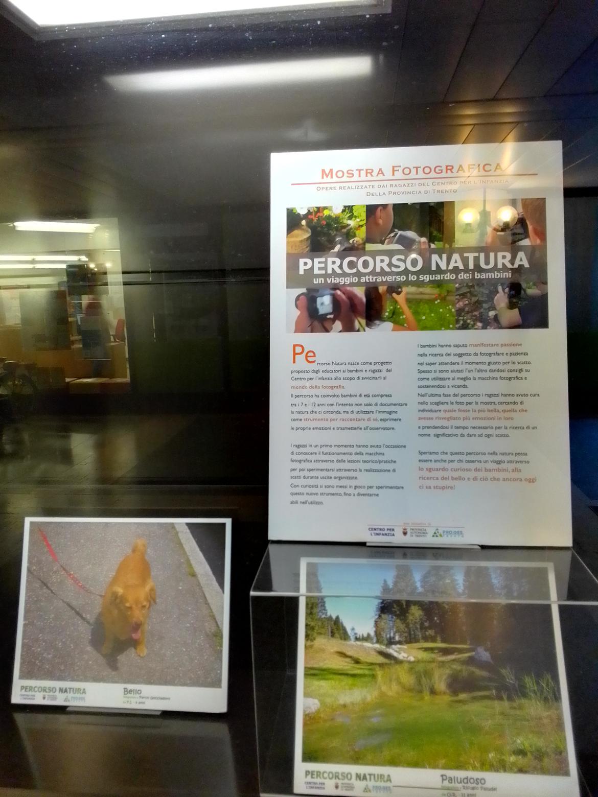In esposizione le immagini della mostra fotografica Percorso natura, pensata dagli operatori del centro per l'infanzia di Trento per dare ai bambini e ragazzi, ospiti della struttura, la possibilità di guardare il mondo che li circonda con un occhio più attento al mondo che ci circonda. Più di 50 fotografie scattate ammirando, scoprendo e rispettando il bene più prezioso.